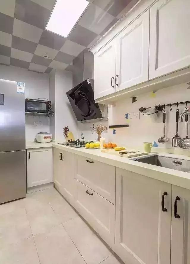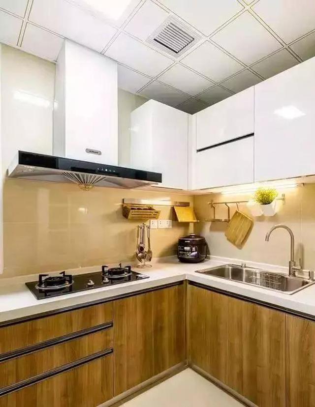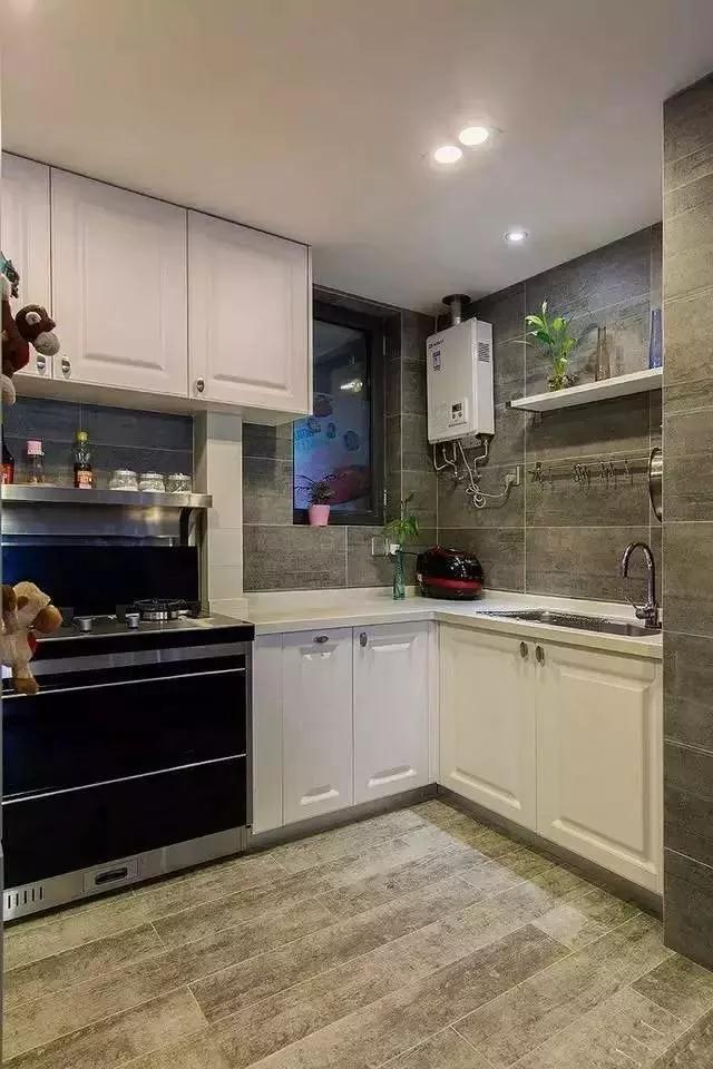 一般商品房常见的厨房大小,厨房的采光并不是很好,用了亮面的柜门,上班族一般晚上回家做饭,吊柜下方安装照明灯更方便。