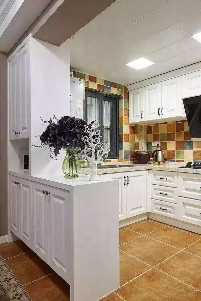 这个也是开放式的厨房,还有小吧台。白色橱柜百搭各种颜色材质的砖,可以出来不同的效果。