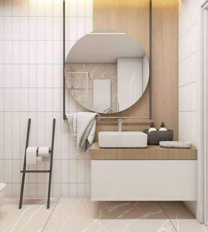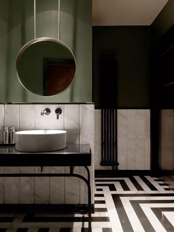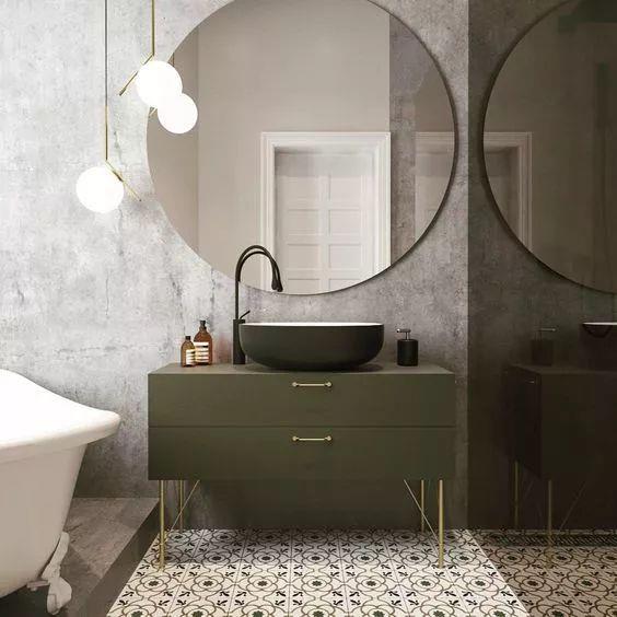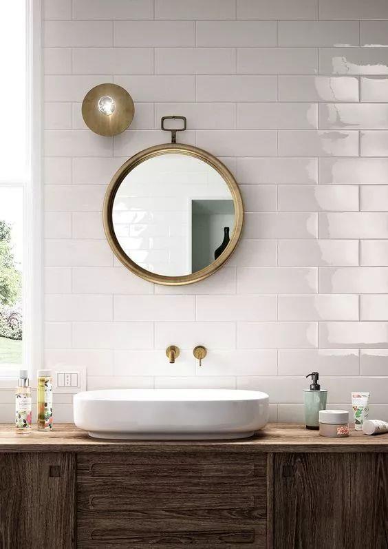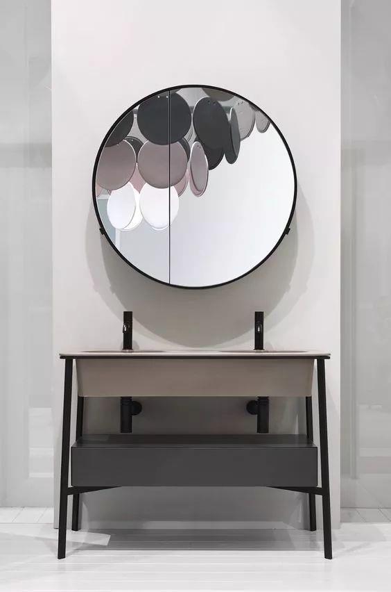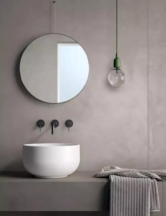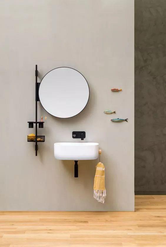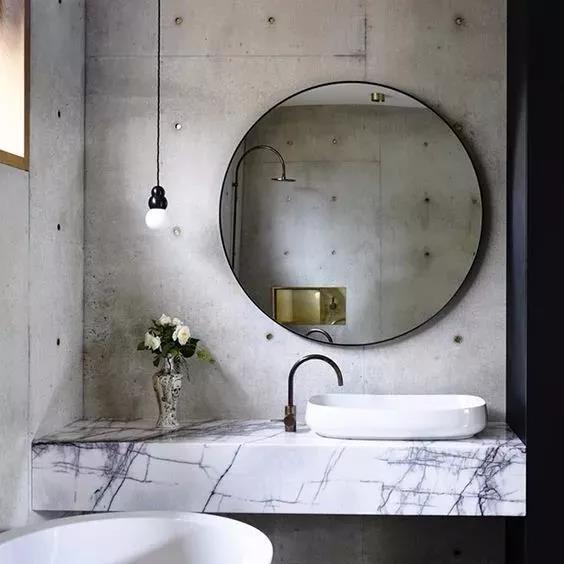受够了家装市场死板的方镜了,也许你可以尝试一下更灵活的圆镜。我们可以把洗漱台想象成平面,圆镜较之方镜,虽然看上去不够饱满或者说利用率不高,但适当的留白会让空间更有张力,圆润的造型也会让人感觉更为舒适和友好,与环境和其他饰品的融合度更高。