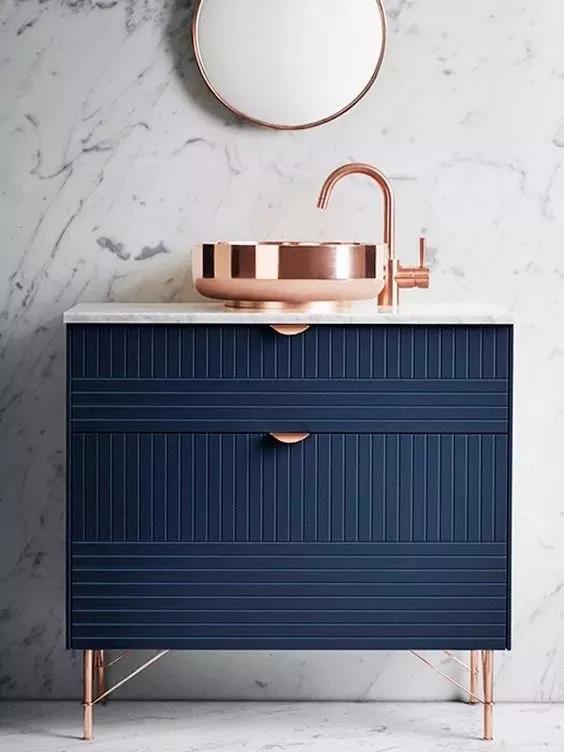 圆镜的边框采用了时下最流行的黄铜元素,与柜脚、台盆、五金相互呼应,轻轻松松打造轻奢感。