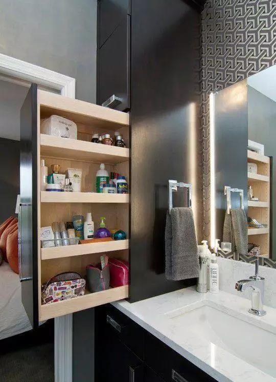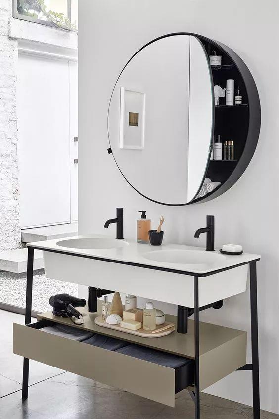 最常规的镜柜+抽屉洗漱台是首选,隔断密封的收放,既能防止浴室水分过大而导致物品潮湿发霉,关起柜门洗漱台则是空无一物的洁净。