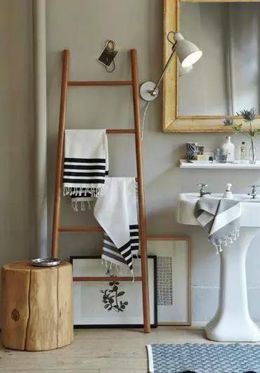 一张梯子来装点,文艺气息就有了。就算简陋非常,随意一搁置便透露出一股随性的生活态度,可以用来悬挂毛巾也能用来悬挂多一层的置物架,废物利用却又彰显好品味。