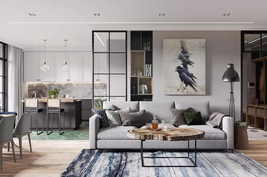 相较于以前被割裂的功能区设计,90后的客厅,展现出花样百出的开放式设计。可以说,除了卧室与卫生间之外,其他区域大多保持开放式,与客厅直接相连!而这些年最 Fashion 的空间布局,莫过于客、餐、厨、阳台一体化了。