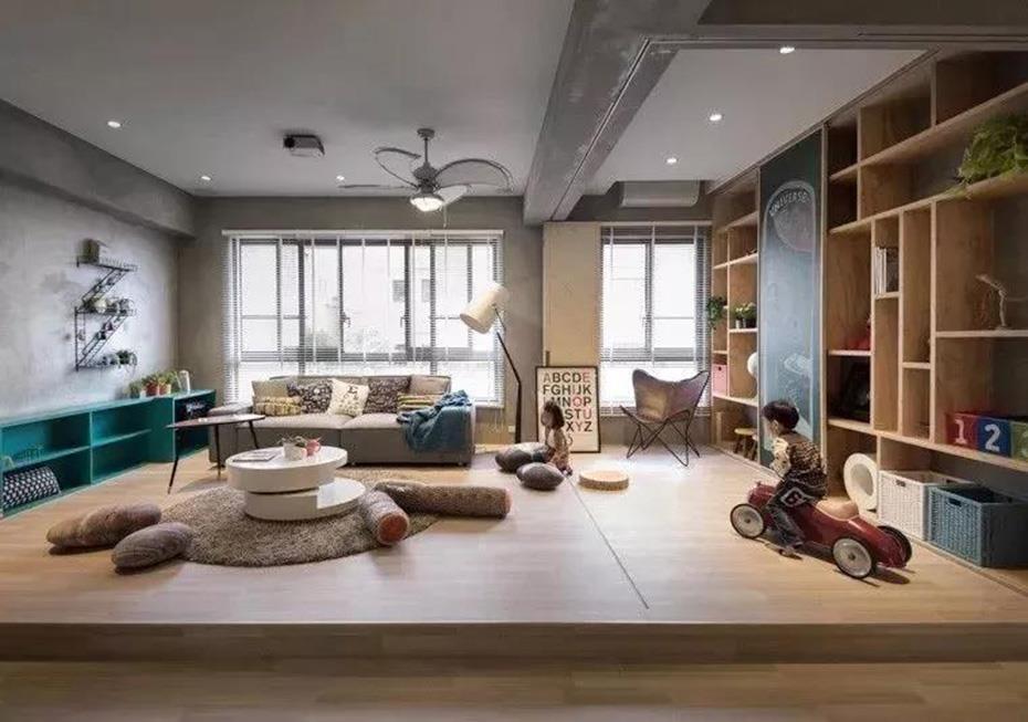 有些人喜欢在客厅增加娱乐功能,比如在这里健身或者作为孩子的游戏区,就可以把电视放在角落,这样就能留出大片空间,完善客厅的娱乐功能。小孩子可以在这写作业,爸妈在这工作。互不干扰,又能自主交流。