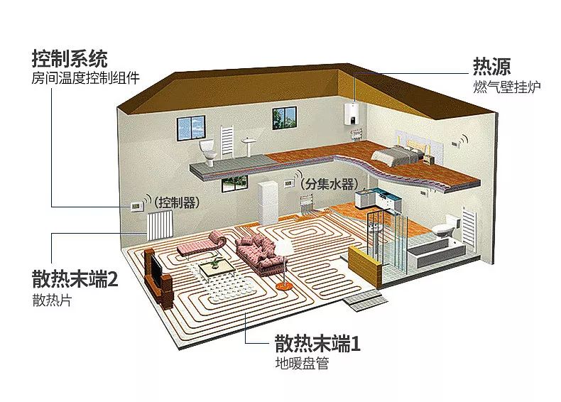 2、三种发热末端:地暖盘管、散热片、地暖盘管+散热片