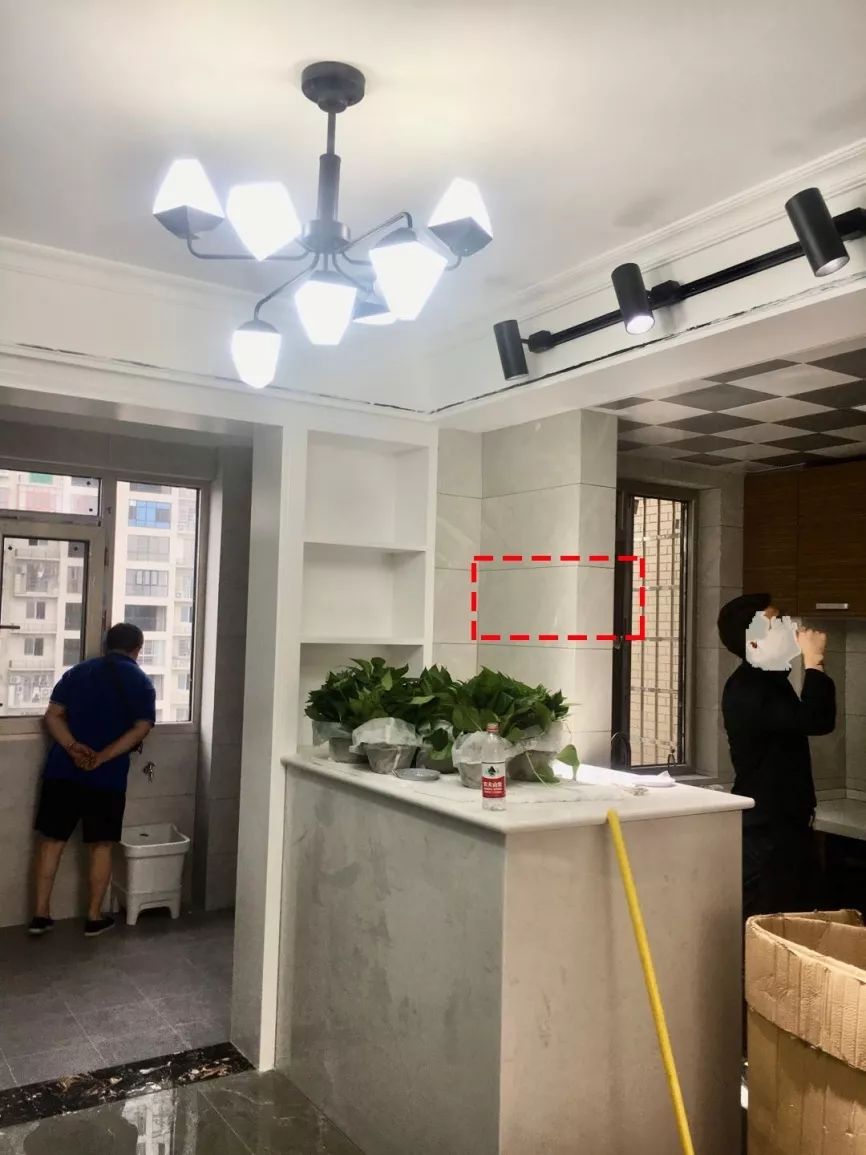 上图户型结构中,设计师打掉了红色方形线框处的墙体,将布局改为餐厨一体的开放式厨房。在平面布局上完全没有考虑壁挂炉放哪里的问题。