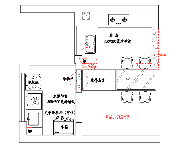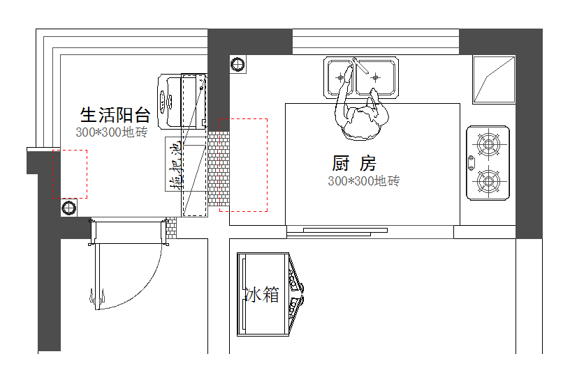 上图U型厨房考虑到烟管位置,灶台最好放右手边,此种情况如果我们要将壁挂炉放在厨房,只能放在厨房左手边红色线框处,考虑到厨房没有吊柜的位置,最终跟业主商量壁挂炉放在生活阳台红色线框处。