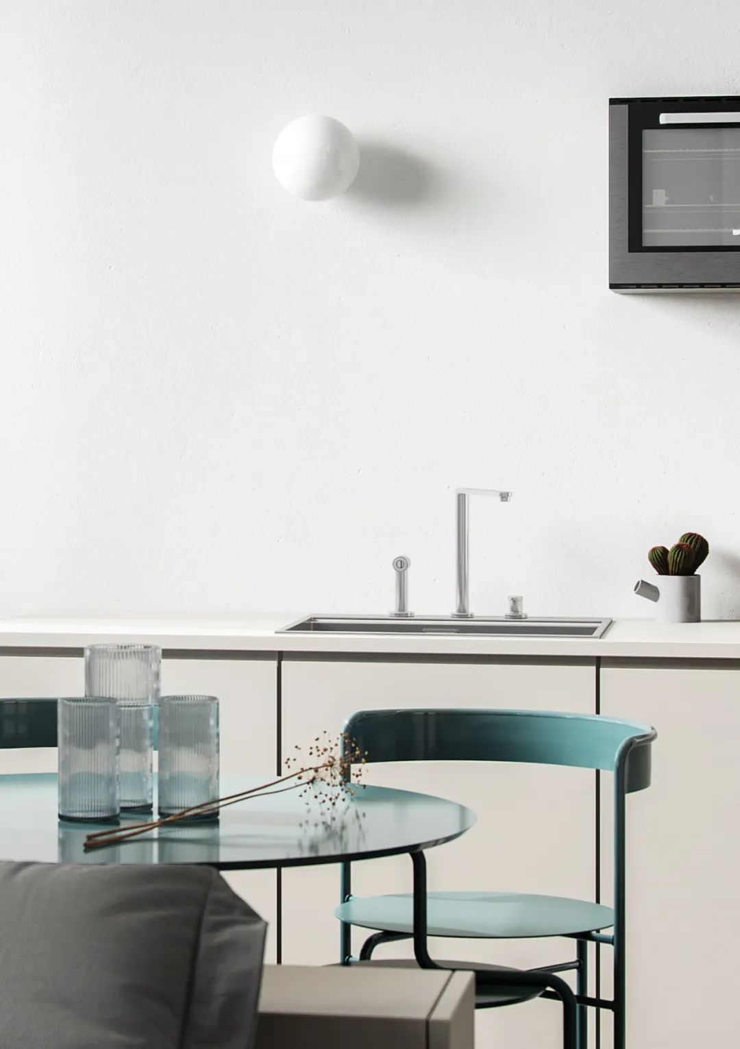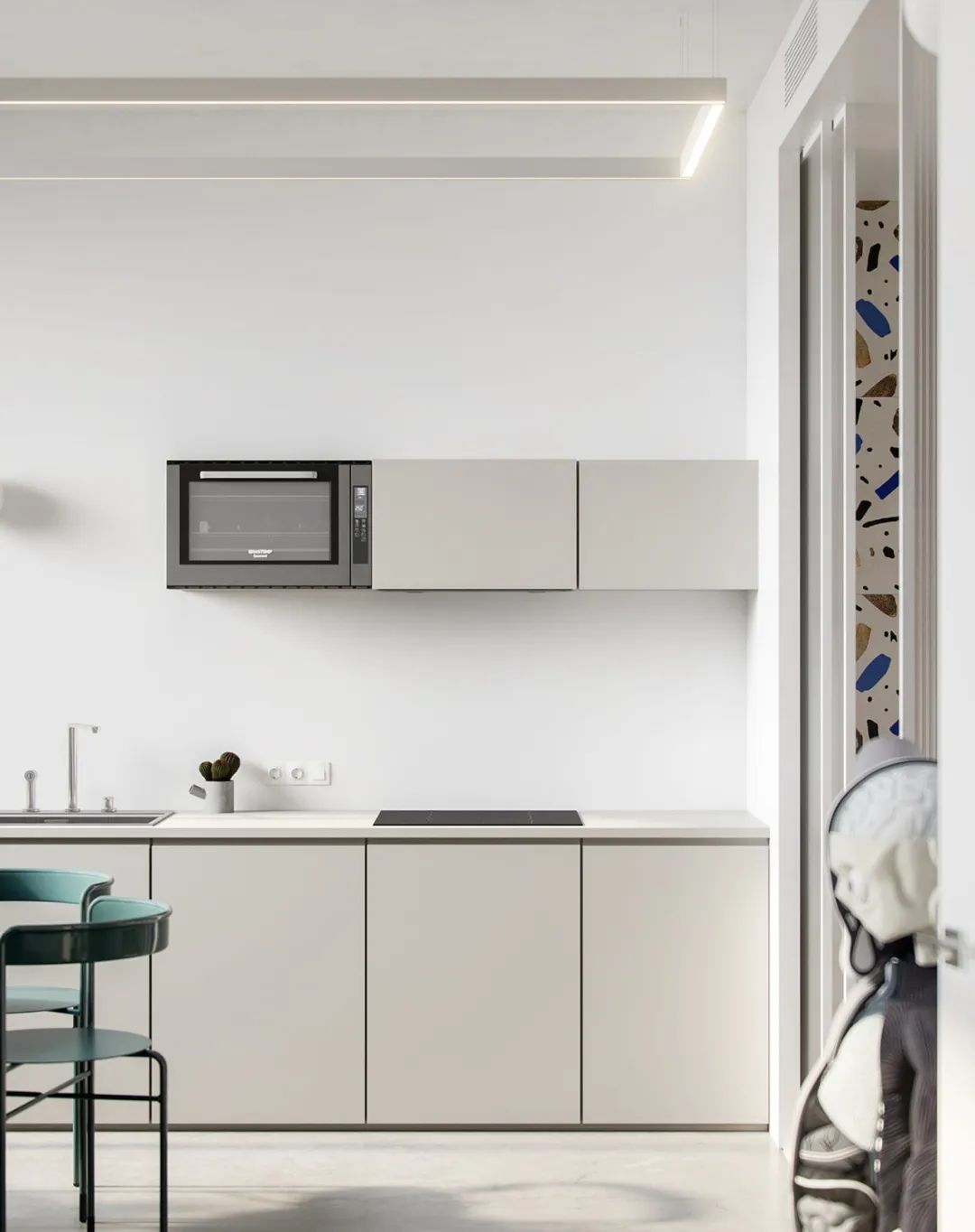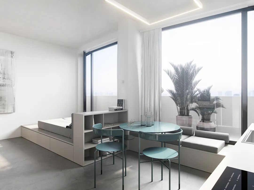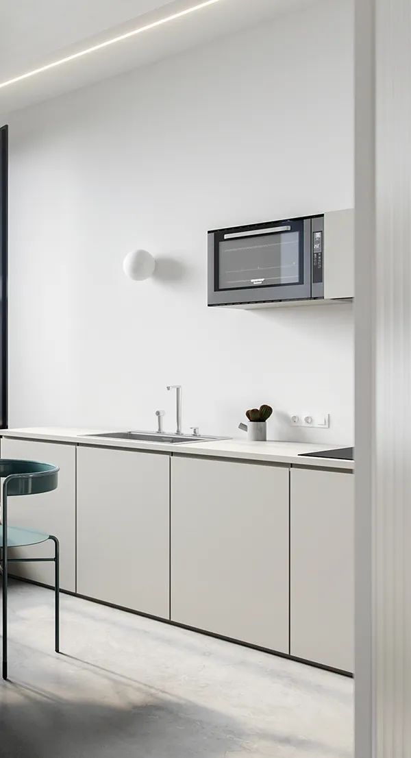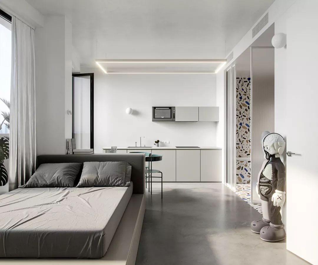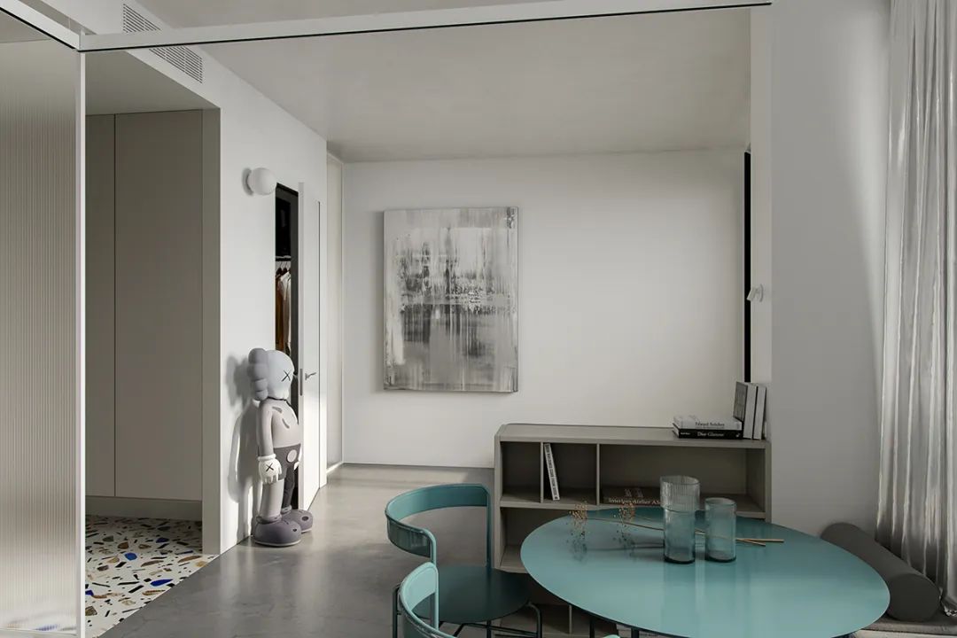不难发现,这么小的空间,全开放式,客厅餐厅厨房一体,以灰白为主色调,自流平水泥地板,绿色的餐桌非常吸睛,大大的玻璃窗光线充足,显得空间很大。