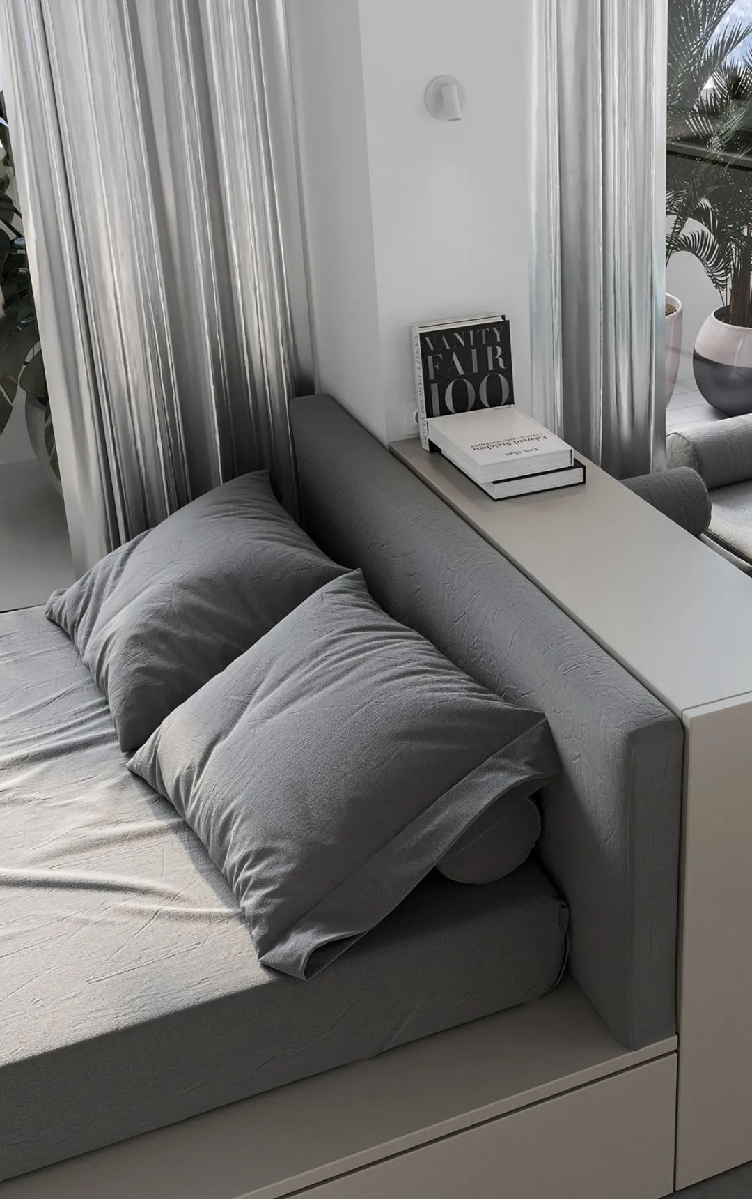 是客厅也是卧室,设计师用定制榻榻米,床头做成书柜,内部可储存很多杂物,非常方便。