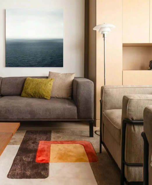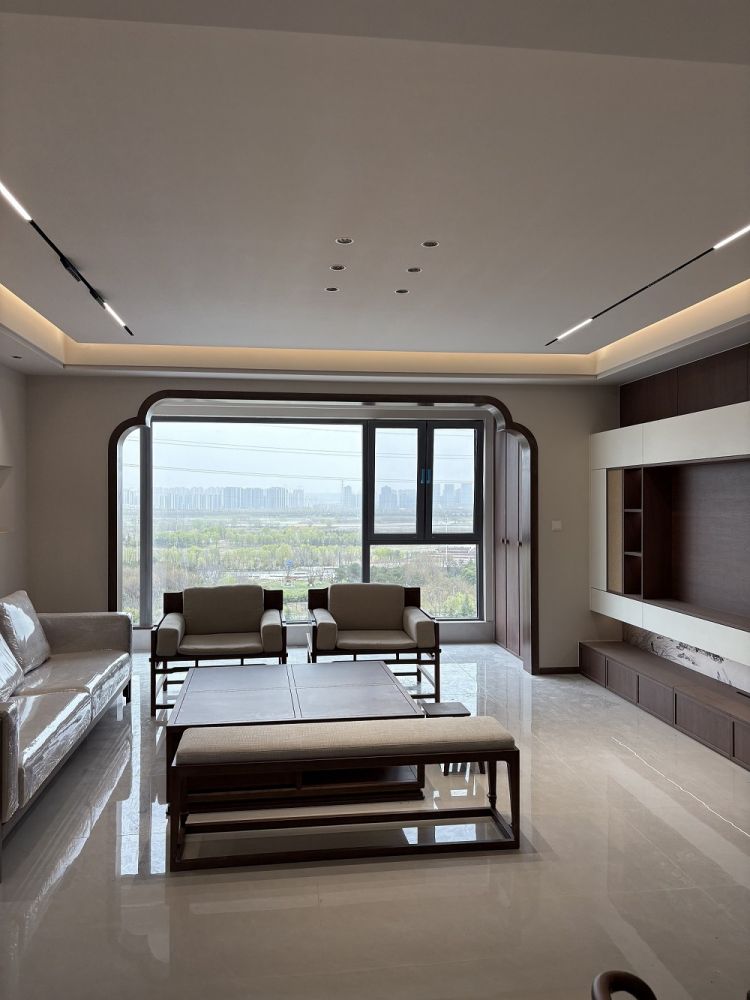 简约雅致、温润沉静的东方质感。- 采用黑胡桃木框架+棉麻/皮质软包的组合,线条利落、比例舒展,是典型的宋式家具“删繁就简”的特征。- 大面积落地窗搭配弧形垭口,既保留了中式园林的框景手法,又最大化引入自然光线与窗外城市景观。没有繁复的雕饰,只有木色与光影的对话,宋...
