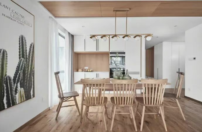 峰光无限装饰小编为大家今日介绍,客餐厅简洁明了,大白墙搭配原木地板,简约大方、舒适自然。 家具以北欧风彩色单品为主,丰富空间色彩又不显单调。白色窗纱点缀,增添了一抹朦胧的美感。 避免开门见厅,设计上做了上下分体式鞋柜,提高私密性空间也不完全封闭。薄荷绿的...