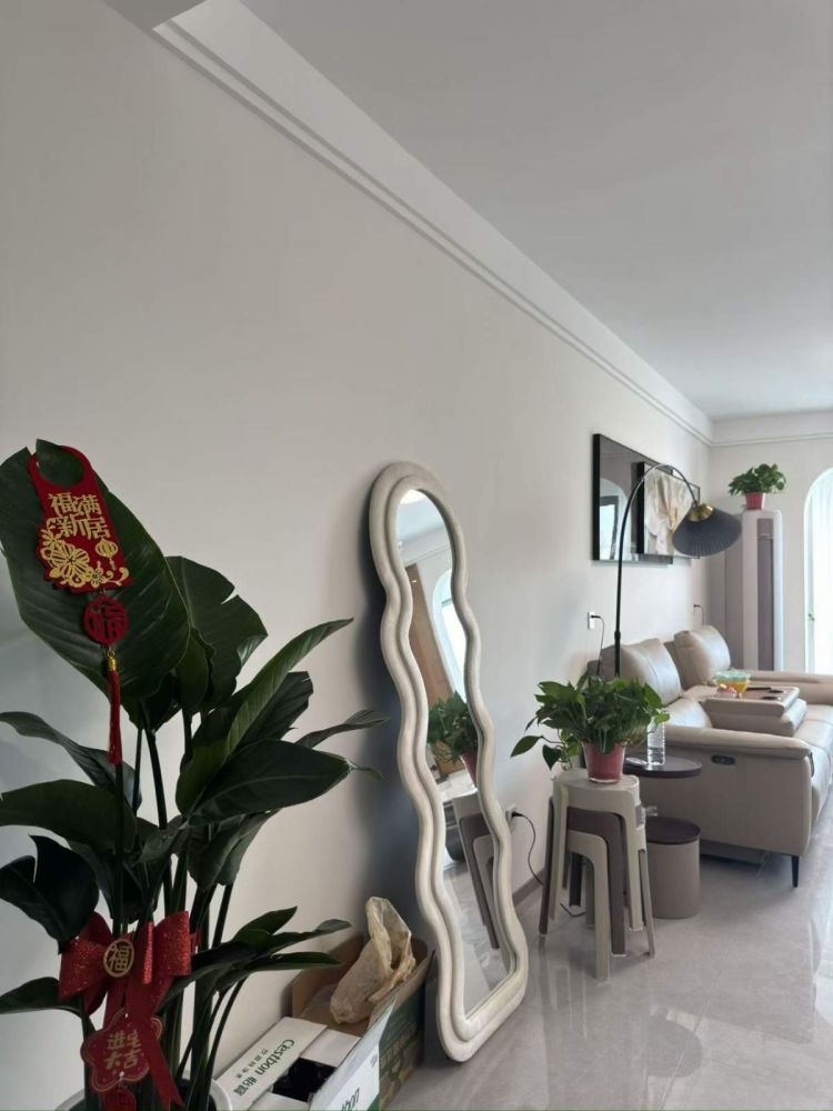 镜子+绿植+收纳(纸箱),兼顾了实用、美观与生活气息,是典型的“刚入住不久”的新居状态。 弧形窗-柔化了空间棱角,是当下流行的“温柔感”设计元素,让硬朗的现代风多了几分柔和。 枪灰色恒温淋浴花洒套装,包含顶喷+手持花洒双模式,满足不同淋浴需求,枪灰色耐脏...