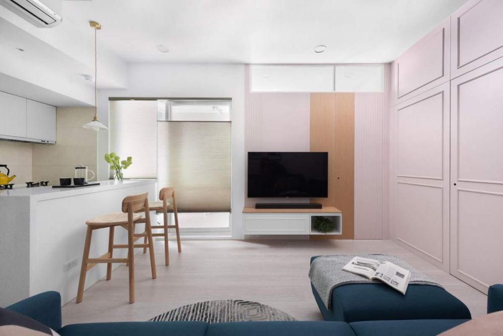峰光无限带你看设计。 年轻夫妻小面积房,在空间受限下,运用隐藏门达到电视墙放大效果,并延伸主卧房门及浴室门,让公领域墙面完整且连续,视觉放大。 客厅以木纹搭粉色系,融入新婚气息,进入主卧的木纹搭粉色系,融入新婚气息,进入主卧的木纹配...