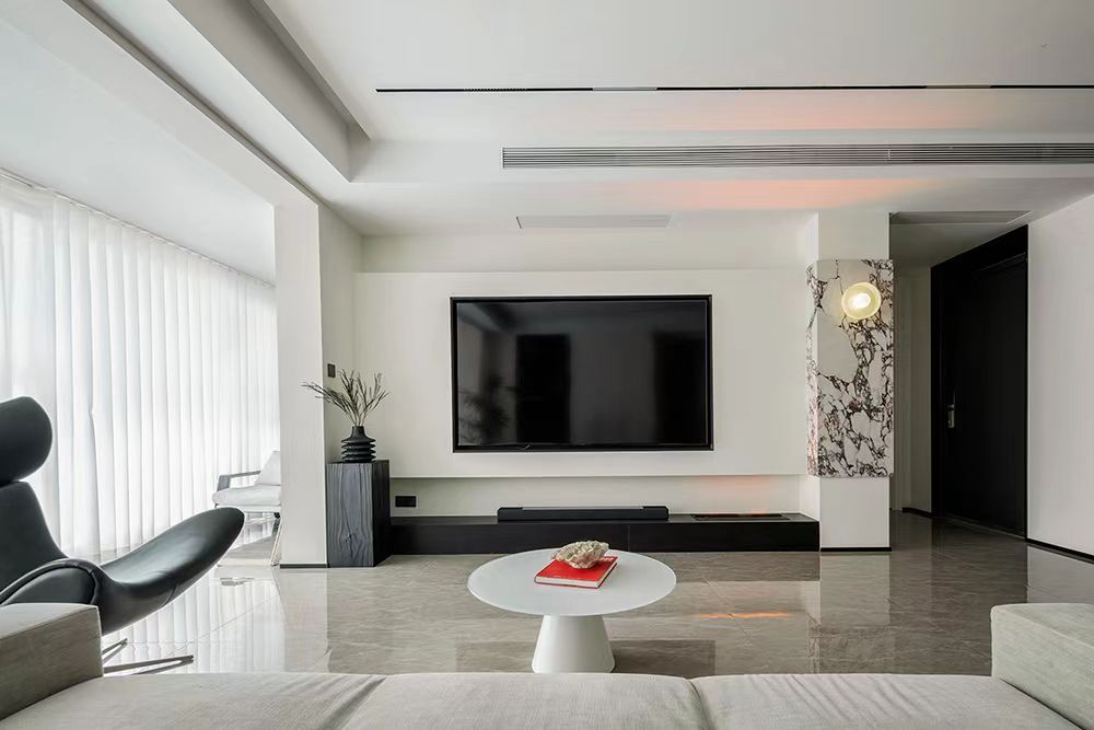 今天咸阳峰光无限小编给大家分享一套135现代简约风 黑白经典组合的形式也很丰富,电视,大理石的花纹还有收纳柜和火炉,简约的设计下,空间拥有足够的温暖。艺术设计简洁流畅,光影也成为装饰的一部分,带来明亮感觉...