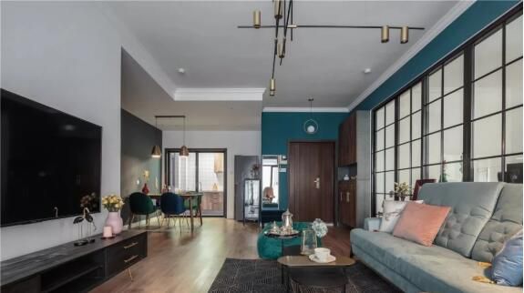 考虑到业主平时都是一个人居住,想尽量让家里的色 墙色选择了深灰绿+浅灰的搭配,和浅蓝色的沙发形成同一冷调, 。 选择了深灰色的背景,当灯光开启时,有一种独特的魅力。 餐桌是可拉伸式的,最多可拉伸到1.9米, 将冰箱移到客厅后,厨房空间就比较宽...