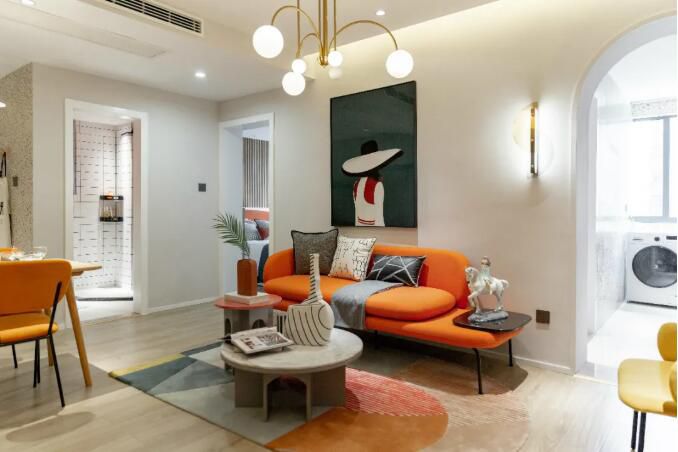 峰光无限装饰小编今日分享是一套56平米的小公寓中,整体空间以现代风的空间, 布置金属质感与鲜艳的软装,让空间透露出一种轻奢高级的气质,在大面积 橙色的运用下,细节装饰画加入女性背影的优雅画面,使得空间充满华丽高级的档次与气质。 小公寓的客厅与餐厅一体化...