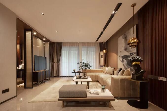 峰光无限装饰小编今日分享的是143平米的房子,整个空间的墙面加入大范围的木饰面, 在稳重的空间基调下,布置上轻奢格调的细节软装,营造出一种稳重端庄的空间氛围,让生活充满精致与品质。 空调天花吊顶作品,采取无主灯的设计,沙发上方加入一道黑色的灯槽, ...