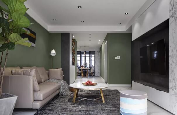 。 一、玄关 在入门处正对墙面定制了端景台+鞋柜的组合设计,白色橱柜+黑色搁架+绿植图片,让人一进门就觉得很有格调。 二、客厅 看起来层次更清晰。墨绿色的沙发墙设计,搭配皮质的沙发+大理石加金属茶几,精致奢华。 三...