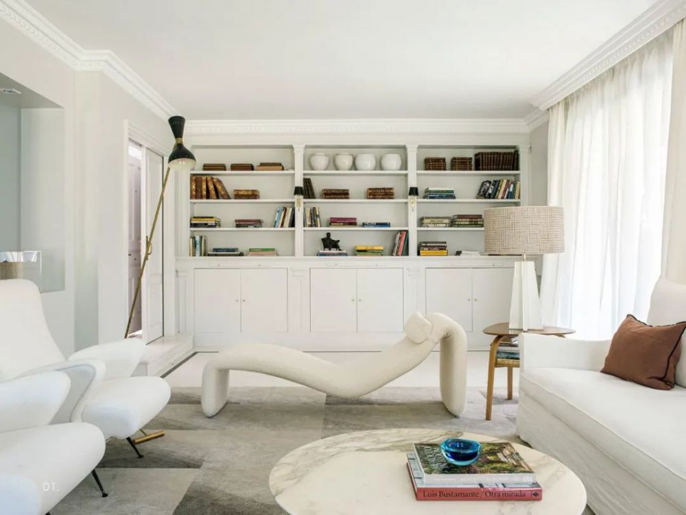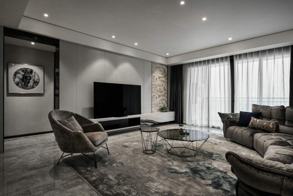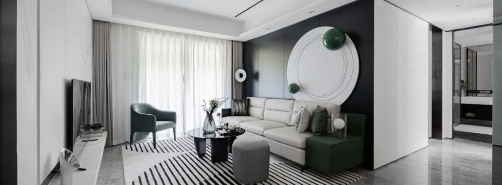 峰光无限带你看设计。 迈入空间的一刻 目光被简约高雅的配色抓牢 大面积圆形挂画打破黑色墙面的沉闷感 立体圆润的元素跳跃出现 这与条纹样式的地毯、抱枕 恰好形成了有趣的互动 不经意流露出浪漫与戏剧化的设计品味 为了使空间...