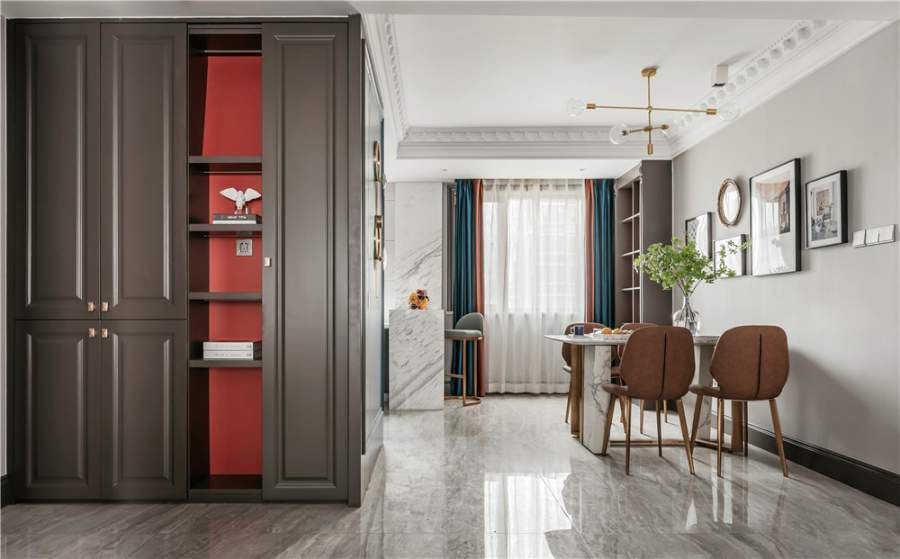 峰光无限带你看设计。 在客厅的空间处理上,对阳台进行了打通,这让空间的动线得以连贯起来。被简化的美式线条,自如地伸展、排列,安静的力量,来自需要时间沉淀才能被理解的灰色。 餐厅厨房拆除墙壁,一个更大的餐厨空间才得以表现出来。餐桌是绝...