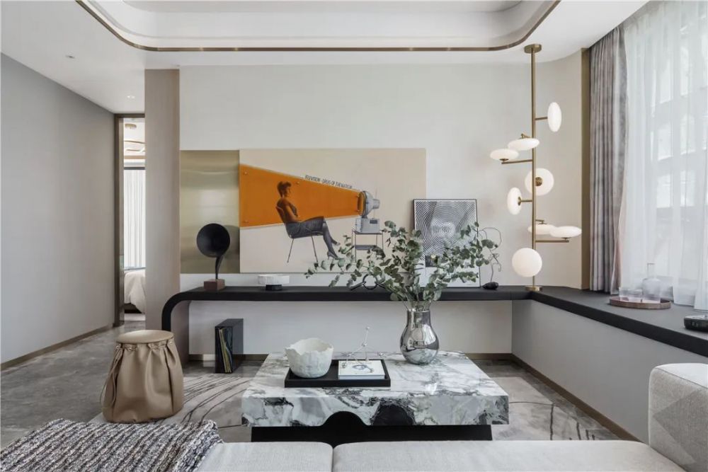 峰光无限带你看设计。 整个空间赋予几何美感的黑白线条与幽微神秘的铜质家具的交融与碰撞,象征着20世纪初贵族社会的优雅风尚。 20世纪的时尚与奢华,通过色彩与材质的碰撞,将整体空间氛围表现到极致。 客厅的空间处理简洁利落,装饰构想却独具匠心...
